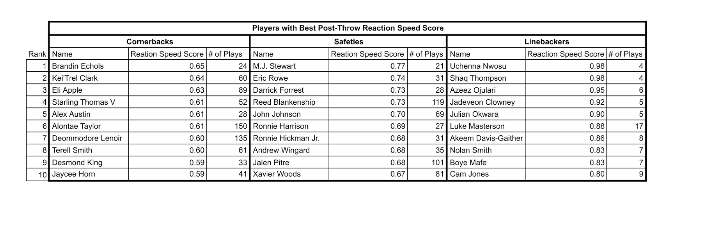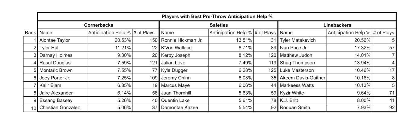 Certain defenders consistently benefit from anticipation adjustments. Their advantage manifests before the ball is even thrown. Below shows the cornerbacks, safeties, and linebackers with the best pre-throw anticipation. Minimum plays were decided by taking the 25th percentile number of plays for each respective position. This threshold will be used for all similar leaderboards.