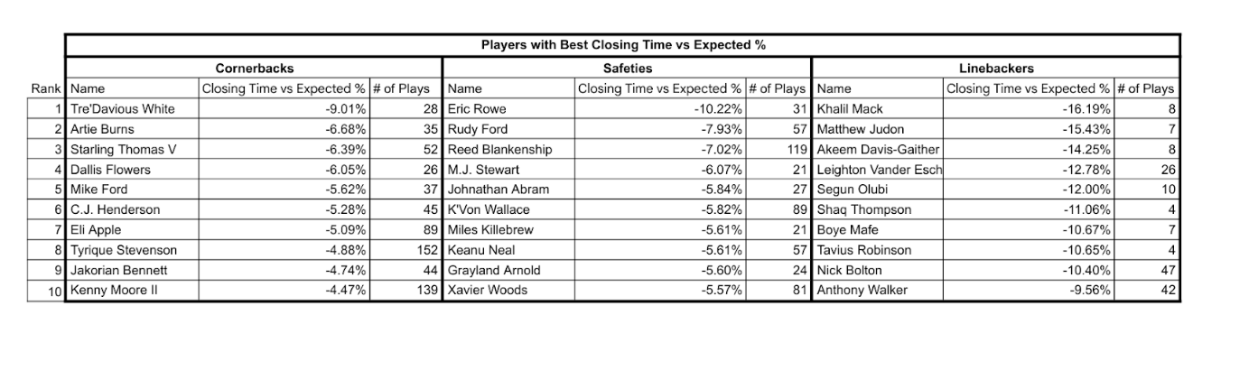 The CTvE leaderboard below highlights the defenders who, on average, outperform their expected closing time the most. Instead of using raw CTvE, which is useful for evaluating individual plays, the leaderboard uses CTvE% (CTvE divided by predicted close-out time) to normalize for play length and allow for effective comparison of how much time each player is saving.