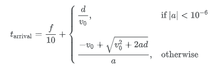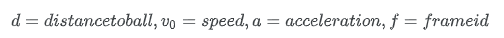 The target variable for the model is Arrival Time, defined as the time from the ball’s release until the defender reaches the landing zone threshold. This threshold is defined as the average distance a player was from the ball on every completion: 2.20 yards. For players that never reached the landing zone before the ball’s arrival, arrival time was estimated using player speed, acceleration, and distance to the landing zone. The kinematics equation for the estimation can be seen here: