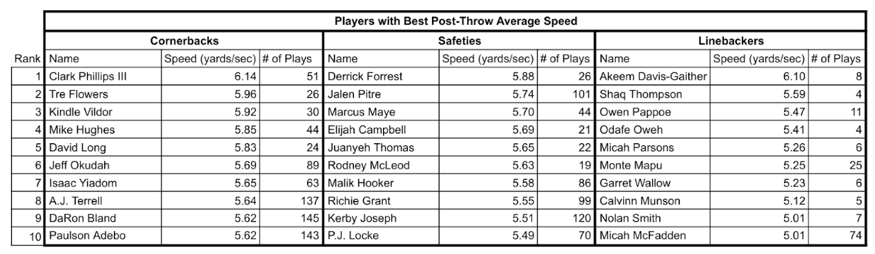 Speed is measured in yards per second during the window from ball release to ball arrival. This captures the defender's physical explosiveness. Below are the players that showed the best speed profile.