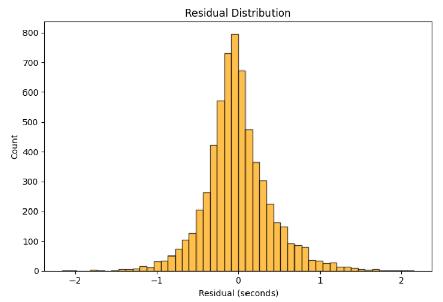 The XGBoost model shows strong alignment between predicted and actual closing times, indicating that the model effectively learns closing behavior from the inputs. It yields an MAE of 0.296 seconds, an RMSE of 0.410 seconds, and an R2 of 0.823. Below is a bar graph showing the residual error distributions, conveying strong model performance.