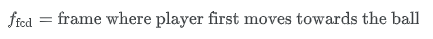 An easy way to think about this formula is that if a defender’s first movement toward the ball occurs on frame 1, they receive a score of 1.0. For every additional frame before their first movement towards the ball, 0.1 is subtracted from their score. Because the lowest possible score is 0, taking 11 frames (1.1 seconds) or more results in a score of 0.