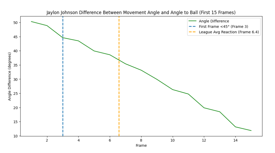 The graph above shows Johnson achieving the angle difference threshold 0.3 seconds after the ball is released. This beats the average defender reaction speed by over 0.3 seconds and was the primary reason for Johnson’s interception.